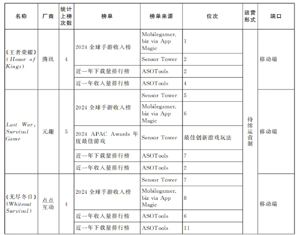 为了细化中国出海的移动端F2P内购持续运营制游戏的海外接受度,本研究还进一步整理了专门针对移动端游戏(手游)的榜单,统计情况如表2所示。