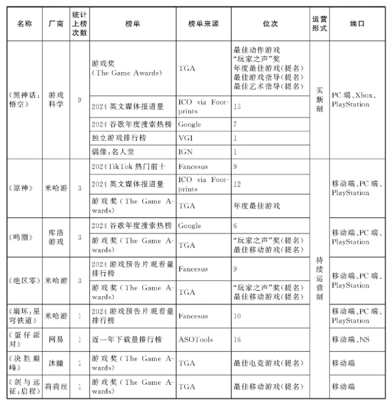 根据海外的综合搜索引擎平台(Google)、奖项评议组(TGA)、多媒体评论网站(IGN)、数据研究机构(ICO等)细分榜单提供的搜索量、曝光量、下载量、内容、综合评分等数据(见表1)可知,除现象级作品《黑神话》仅在非移动端(PC端与主机端)发售且为付费体验制(买断制)外,进入各大榜单的中国游戏均具备移动端版本,且均为F2P内购、持续运营制。