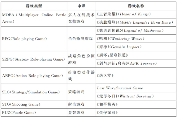 从终端发售方式划分游戏类型,可分为主机游戏(原名console game,又名电视游戏,包含掌机游戏和家用机游戏两部分,是一种用来娱乐的交互式多媒体,通常是指将电视屏幕作为显示器,在电视上使用家用主机的游戏,常见的主机端有任天堂的“Switch”、微软的“Xbox”和索尼的“PlayStation”等)、电脑端游戏(PC游戏)、移动端游戏(通常是指手机游戏,包括iOS端、安卓端、鸿蒙端等);从售卖方式上划分,可分为购买软件的买断制(玩家购买后可将游戏软件下载到自己的设备上,一次付费即可获得终身使用权)、购买时间的点卡制(包括月卡制等,玩家付费购买的是游戏的体验时间),以及“免费—内购”的F2P(free-to-play)式持续运营制。中国游戏海外发行由以下两种类型构成:主机游戏与电脑游戏统称为“非移动端游戏”,与“移动端游戏”相对;买断制游戏与点卡制游戏统称为“付费体验制游戏”,与F2P“免费—内购”制游戏相对。当前,中国游戏的海外传播主要集中于移动游戏领域,依靠头部厂商如腾讯、米哈游等推出的《王者荣耀》《原神》《鸣潮》等F2P式持续运营制移动端游戏,凭借多端多平台互通的技术架构、跨领域整合的营销策略以及融合文化元素的创新设计,构成出海的主力军。