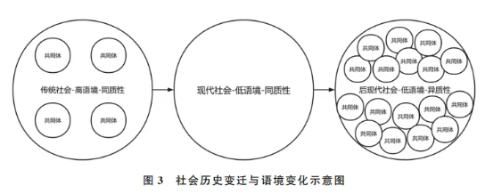 综上所述,高/低语境文化并非能够对不同国家简单张贴的本质主义标签,而是各类借由传播构成的文化共同体在复杂的意义活动中的历史实践结果。人类社会中的共同体天然有高语境化的趋势,但历史的更迭和变迁往往能够让这种趋势得到逆转。用马克思的话来说,“支配着物质生产资料的阶级,同时也支配着精神生产资料”。这意味着社会的每一次政治更迭,理论上都是一次对既有文化语境的部分清理和更新。新社会中传播活动的型文本需要得到重新组织和约定,同时根据对旧文化语境的继承程度而决定新社会文化的语境高低。在传统的封建社会中,王朝的更迭虽然一定程度重启了政治共同体的意义积累过程,但社会传播的主要型文本特质却没有发生根本变化,因此,封建社会仍然以高语境文化为底色。而现代社会是一次颠覆式的意义重构,文化中的型文本发生的重大转折,伴随着全球化的发展,人类社会整体走向低语境化,并在现代性的逻辑下保持着基本的同质性。虽然后现代社会的来临存在着对理性与科学特质的型文本的颠覆,但群体共同体的兴起导致了社会的分化和共同语境的缺失,人类社会走向一种高度异质性的低语境文化形态,人们却同时生活在各类高语境文化的群体中。