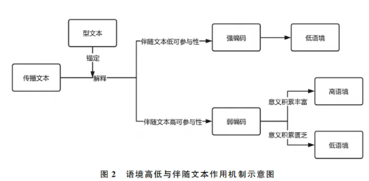 综上所述,若型文本是一种弱编码要求,即其他伴随文本具有高可参与性,且该传播活动具有丰富的伴随文本积累,则为高语境交流;若传播活动伴随文本积累较少(如临时相识的两个人,虽然交流类型是弱编码,但二者并没有先前的共同伴随文本积累),或型文本本身是强编码要求,则为低语境交流(见图2)。事实上,语境的高低仍然可以沿袭霍尔所采纳的系统论进行讨论,但其机制并不仅仅是系统中预制程序的复杂程度这么简单。伴随文本的可参与性和丰富性作为两个不同的程序,在系统逻辑上不仅有先后,同时还构成“与”门逻辑—只有当两个条件同时满足时,高语境的结果方能实现。