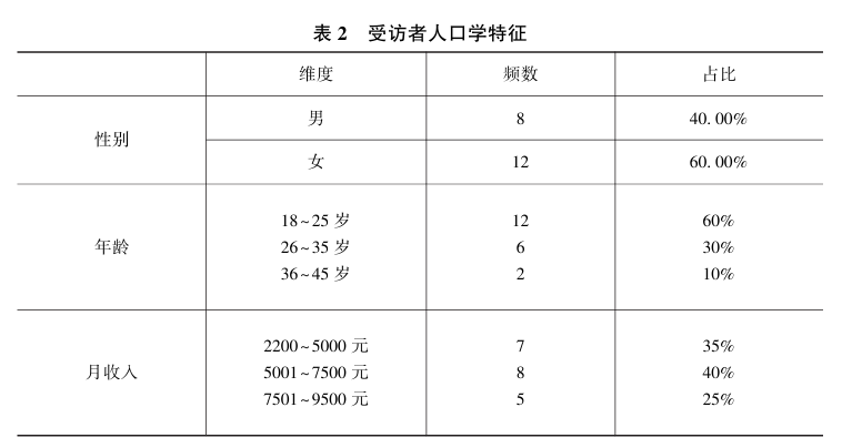 本文随机选择了20位受访者, 访谈地点在学校附近的咖啡厅。 被访者的选择标准为: 最近半年内观看过直播并购买产品; 曾购买3位以上不同主播推荐的产品。 访谈结束后, 统计了受访者的人口学特征 (见表2)。 每次访谈时间控制在20分钟内, 访谈工作由研究成员负责。 通过对第一手访谈资料和第二手报告数据的整理, 得到了1万余字的文本数据。