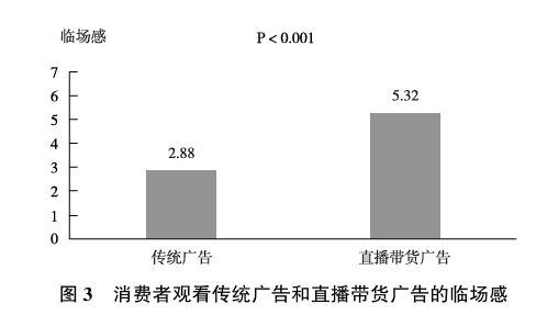 预实验的目的是验证, 与传统广告相比, 直播带货广告能够带来更强的社会临场感。 本文邀请了50位学生参与预实验 (男性21人, 占42%, 女性29 人, 占58%, 平均年龄为22.5岁)。 实验过程中, 随机将50位受试者分为两组。 对照组观看30秒的传统广告, 实验组观看30秒的直播带货广告, 然后要求受试者回答以下问题: 观看过程中是否感受到与他人接触的情景、 是否有社交互动的感受、 是否感受到信息交流。 每道题目使用李克特量表 (Likert scale) 中的7 分量表, 1分表示 “非常不同意”, 7分表示 “非常同意”。 实验结束后, 本文对数据进行统计分析。 实验结果显示, 第二组 (直播带货广告)的社会临场感得分显著高于第一组 (传统广告)。 通过独立样本t检验分析发现, 直播带货广告组的临场感 (M2=5.32) 显著高于传统广告组 (M1= 2. 88, P<0. 001为非常显著; P<0.05 为显著, P<0.01 为高度显著)。 具体结果如图3所示