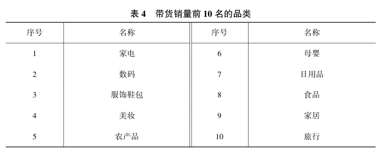 研究三通过问卷调查的方式, 旨在探讨四种类型主播的核心特质是什么, 以及每种类型主播适合带货的品类。 本研究的问卷分为两个部分: 第一部分调查四种类型主播在五种特质上的得分,以及四种类型主播在带货销量前10名的品类 (见表4) 上的效果, 以此识别每种类型主播与不同产品的匹配度。