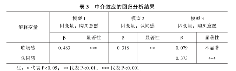 此外, 通过中介效应的回归分析发现, 当临场感回归至购买意愿时, 主效应显著 (β=0.483,P<0.001, 模型1)。 进一步当临场感回归至认同感时, 主效应显著 (β=0.318, P<0.01, 模型2)。最后, 临场感与认同感同时对购买意愿回归后, 临场感的主效应不显著, 但是认同感的主效应显著(β1=0. 079, P1=0. 604; β2=0. 373, P2<0. 001; 模型 3)。 具体结果如表3 所示