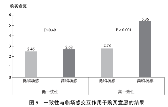 实验的操纵检验结果显示: 王某强组的一致性得分显著高于王某博组(M1=6. 02, M2=3. 20, P<0. 001)。 进一步分析发现, 一致性对临场感的调节作用显著, 支持了假设H3。 在低一致性条件下,临场感的高低对购买意愿没有显著影响 (M1=2.46, M2=2.68, P=0.49), 然而在高一致性条件下, 临场感对购买意愿的主效应显著存在 (M3=2.78, M4=5.36, P<0.001)。 具体结果如图5所示。