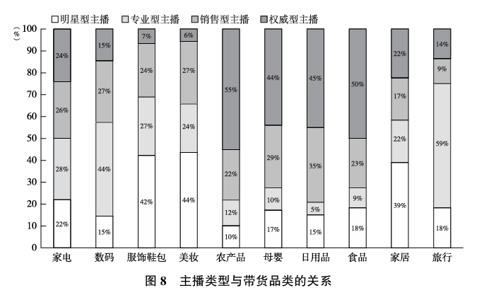 问卷的第二部分是关于主播类型与带货品类之间的匹配关系。 从图8可以看出, 家电类产品带货效果最好的是专业型主播、 数码类产品带货效果最好的依然是专业型主播、 服饰鞋包类产品带货效果最好的是明星型主播、 美妆类产品带货效果最好的是明星型主播、 农产品带货效果最好的是权威型主播、母婴类产品带货最好的是权威型主播、 日用品带货效果最好的是权威型主播、食品带货效果最好的是权威型主播、 家居类产品带货效果最好的是明星型主播、旅行类产品带货效果最好的是专业型主播。