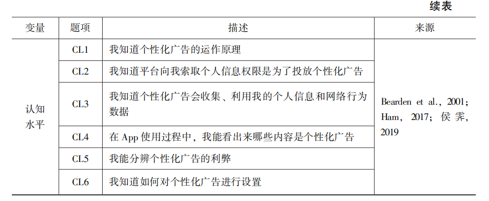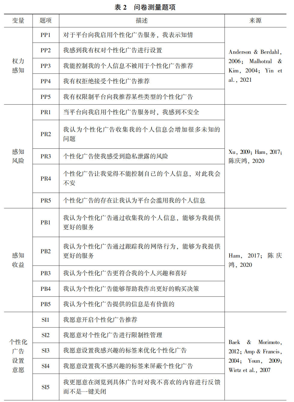 本研究针对权力感知、感知风险、感知收益及个性化广告设置意愿、认知水平等变量设计的量表均在已有权威研究的基础上进行了适应性改编(见表2),并根据量表对其外显变量的测量结果,探讨主要变量之间的相互关系。所有测量题项均采用李克特5级量表进行评分(1表示非常不同意,5表示非常同意)。