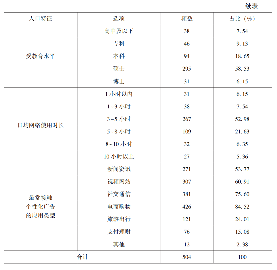 根据已有的研究结果证明,用户的学历水平越高,网络使用年限越久,其个人信息披露意愿越明显。此外,不同性别用户对于隐私关注或隐私保护意愿的态度存在显著差异,如男性比女性更偏向于提供个人信息。尽管年龄和应用类型在绝大部分研究中被作为控制变量进行检验,但学者之间并未得出一致的结果。考虑到个性化广告属于一种高隐蔽性的广告形态,用户的网络使用经验以及自身阅历不免会影响其对个性化广告技术与使用场景的理解,而应用类型关乎用户接触个性化广告的类型和频率,为了更好地验证自变量与因变量的关系,本研究在问卷设计时增加了五项个人基本信息采集的题项,在研究中将性别、年龄、受教育水平这些人口统计学特征以及日均网络使用时长、最常接触个性化广告的应用类型这些人口统计学相关特征作为控制变量,以减少对实证结果的干扰,增强研究结论的准确性。
