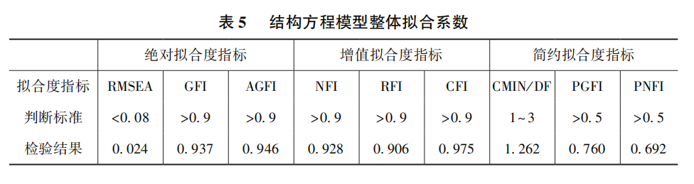 结构方程模型的质量可以通过对比模型变量关系与实际数据所反映的变量关系之间的拟合度来衡量,常用的评估指标众多,本文选取RMSEA、GFI、AGFI、NFI、RFI、CFI、CMIN/DF、PGFI、PNFI9个代表性的检验指标作为依据对模型拟合度进行综合评价。
