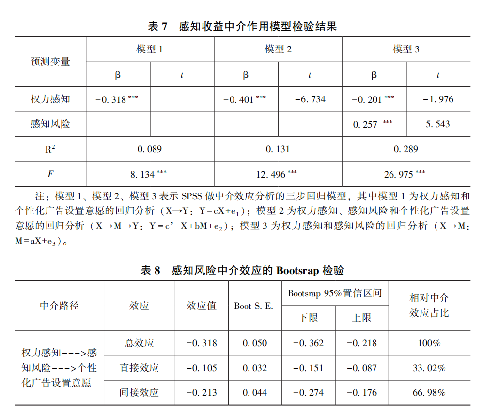 2.感知风险、感知收益在权力感知与个性化广告设置意愿之间起部分中介作用