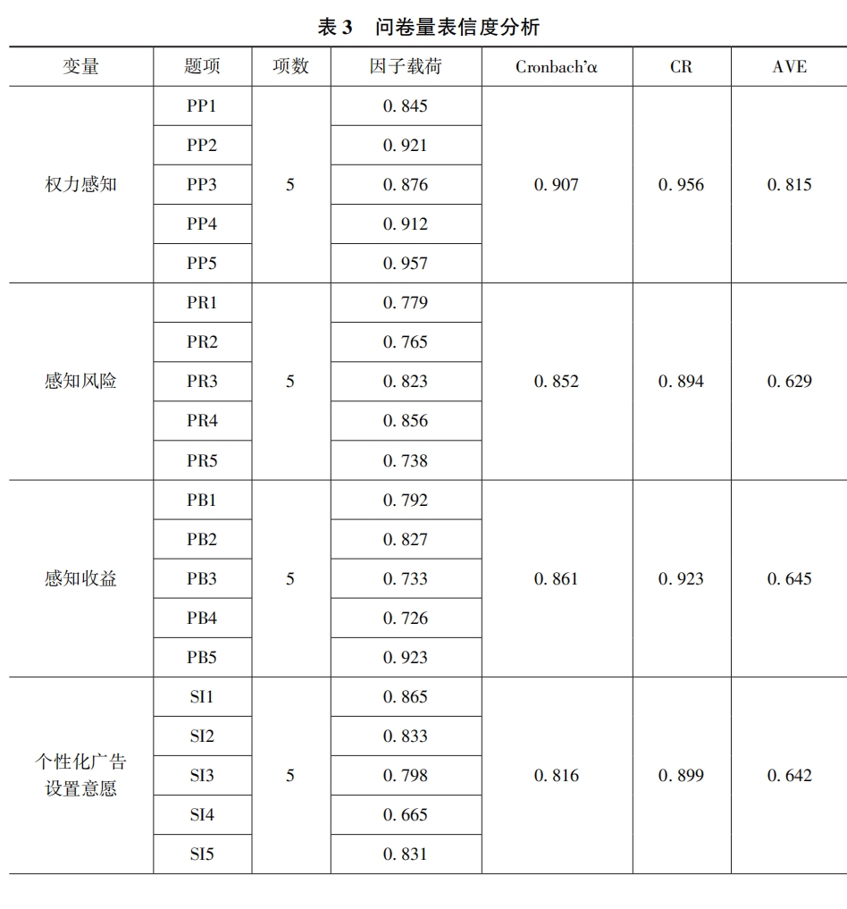 如表3所示,本问卷的Cronbach'α均在0.8以上,高于0.7的信度良好标准,同时权力感知、感知风险、感知收益、个性化广告设置意愿、认知水平各个潜在变量因子与其测量项之间的标准化因子载荷均大于0.7,各个潜在变量因子的平均方差萃取AVE值均大于0.5,组合信度CR值均大于0.8,说明每个测量题项能够很好地测量所对应的变量,问卷整体聚敛效度理想,数据可用于进一步假设检验。