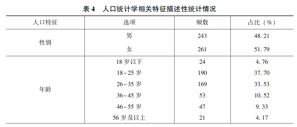 由于各大平台的个性化广告设置功能是针对我国《个人信息保护法》出台而进行的适应性改革,考虑到苹果系统的用户隐私政策依照的是欧盟《通用数据保护条例》标准,因此本研究的调查对象为全体网民中的安卓用户。研究通过在线问卷平台发放研究问卷,并根据预调研结果对问卷进行修改后实施正式调研,剔除问卷选项一致、IP地址重复以及问卷未完成者等无效问卷,共得到有效问卷504份。