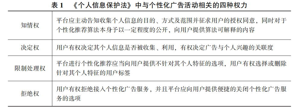 个性化广告是一种高度依赖用户个人信息及网络行为数据进行的精准化广告投放模式,近年来随着各国隐私政策监管的日益严苛,合法合规获取用户的信息数据成为互联网平台开展个性化广告活动的重要前提。我国在2021年出台的《个人信息保护法》着力推动了“知情同意”的合法化,并且提出用户享有知情权、决定权、限制处理权以及拒绝权等权益保障(见表1)。为此,国内各大App相继修改其隐私政策,同时增加个性化广告设置选项,即用户有权对个性化广告进行关闭和限制性管理以保护个人隐私,这一行为触发了用户对权力的感知。既有的研究围绕个性化广告与隐私问题进行了大量的实证,尤其是隐私关注(Internet Privacy Concern,IPC)等相关变量以及隐私计算(Privacy Calculus)如何影响用户的隐私保护意愿或广告回避,然而权力感知在这一过程中的影响尚未得到广泛关注和验证,隐私计算理论和模型正面临新的环境,其适用性有待进一步考察。