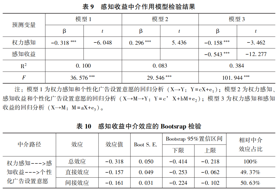 其次,检验感知收益路径是否存在中介效应。表9结果显示,权力感知显著正向影响感知收益(β=0.296,p<0.001),感知收益显著负向影响个性化广告设置意愿(β=-0.543,p<0.001)。权力感知对个性化广告设置意愿的负向影响作用显著(β=-0.318,p<0.001),且放入感知收益之后,权力感知对个性化广告设置意愿的直接影响作用仍显著(β=-0.158,p<0.001)。此外,如表10所示,感知收益作为中介变量的间接效应值为-0.161,相对中介效应占比为50.63%,权力感知对个性化广告设置意愿的直接效应及感知收益的中介效应在95%置信区间的上下限均不包含0,即感知收益在权力感知和个性化广告设置意愿之间发挥部分中介作用,由此假设H7得到支持。
