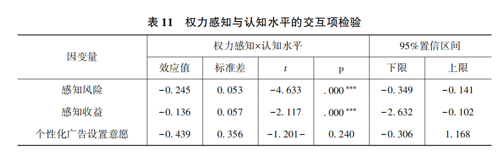 由表11可知,在权力感知对感知风险的影响过程中,权力感知与认知水平的交互项系数在1%水平上显著为负(β=-0.245,p<0.001),并且低水平(M-1SD)与高水平(M+1SD)在95%的置信区间下为(-0.349,-0.141),不包括0在内。这意味着感知权力对感知风险施加影响时,用户对个性化广告认知处于不同水平,其影响幅度具有显著性差异,由此验证了认知水平在自变量权力感知与中介变量感知风险之间的负向调节效应,即假设H8反向成立。同样,在权力感知对感知收益的影响过程中,权力感知与认知水平的交互项在1%水平上显著为负(β=-0.136,p<0.001),并且低水平(M-1SD)与高水平(M+1SD)在95%的置信区间下为(-2.632,-0.102),不包括0在内。结果表明在权力感知对感知收益施加影响时,认知水平的影响幅度具有显著差异,由此验证了认知水平在权力感知与感知收益之间的负向调节效应,即假设H9反向成立。而在权力感知对个性化广告设置意愿的影响过程中,权力感知与认知水平的交互项不显著(p=0.240,p>0.05),并且低水平(M-1SD)与高水平(M+1SD)在95%的置信区间下为(-0.306,1.168),包括0在内,因此认知水平在权力感知与个性化广告设置意愿之间不存在调节效应,即假设H10未得到支持。
