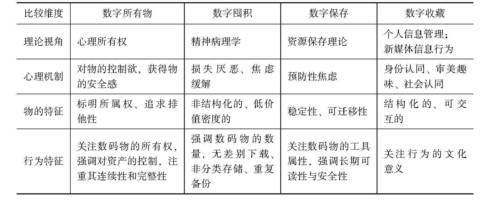 数字技术的发展深刻重塑了个体的日常生活和交往方式。数码物的积累并非简单的代码堆砌和比特度量,而是个体数字化生存的具身化实践。个体与数码物互动行为的研究主要围绕数字所有物(digital possession)、数字囤积(digital hoarding)、数字保存(digital preservation)和数字收藏(digital collecting/favorite)展开,本文通过系统梳理四者的概念边界、心理机制与行为差异(见表1),揭示其背后的人与数码物的多元关系。