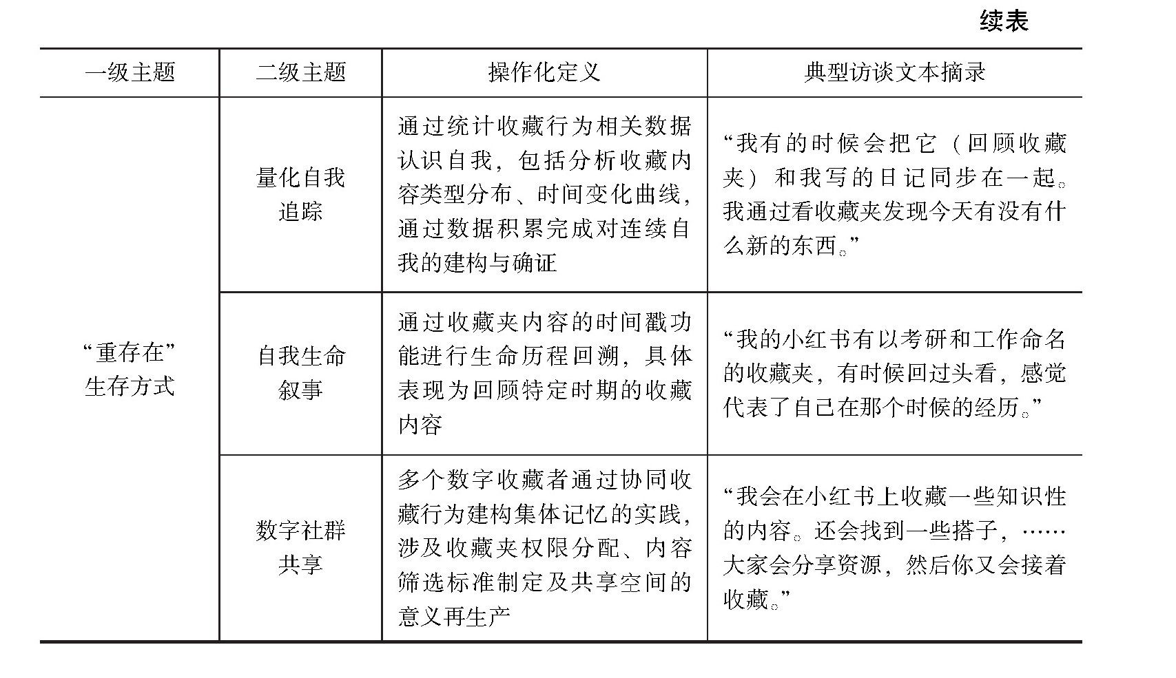 “重存在”的生存方式下的数字收藏行为已超越了对数字信息的工具性“占有”,表现为媒介化的自我追踪实践和自我生命叙事。相较于绩效导向的数据竞争,“重存在”的生存方式则是通过跨平台的历时性数据聚合,建构连续性的生命叙事以实现主体性建构,其内涵随着数字技术演进持续扩展。自我追踪是一种个体系统性记录和分析自身数据的行为,传统的自我追踪的维度集中于步数、心率等生理指标,而社交媒体平台的数字收藏行为则意味着自我追踪范畴从生理指标向认知情感领域的延伸。数字收藏行为可以被理解为数字媒介使用过程的“标记点”,收藏者通过在不同移动设备、平台和网页中锚定时间点,并依据对这些“标记点”的回溯实现自我追踪,进而达到自反性监控的目的。访谈者说:“光是收藏这个行为的本身,它带来了一些心理上的积极暗示,会觉得我现在处在一个比较好的学习状态。再下一步,可能再去真正地学习。”(F4)此类媒介化实践行为并不仅是对数码物的工具性“占有”,还是通过“标记—回溯”实现自反性监视,从而实现主体“认识自我”过程的媒介化。