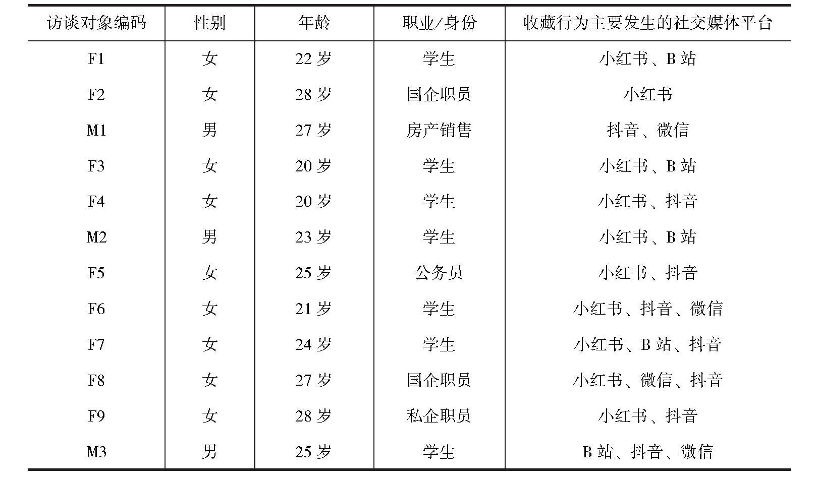 研究通过社交媒体平台公开招募访谈对象,招募标准包括:社交媒体的收藏夹内容数量超过100条;收藏者有整理收藏夹的习惯;收藏行为的发生频率较高,且主观承认收藏行为的重要性。由于未对访谈对象进行主观筛选,最终招募的访谈对象以青年和女性为主。虽然样本结构存在的代际与性别倾斜影响了研究的代表性,但这与社交媒体平台活跃用户的人口统计学特征相呼应,可以为理解数字收藏行为的群体特征提供参考。