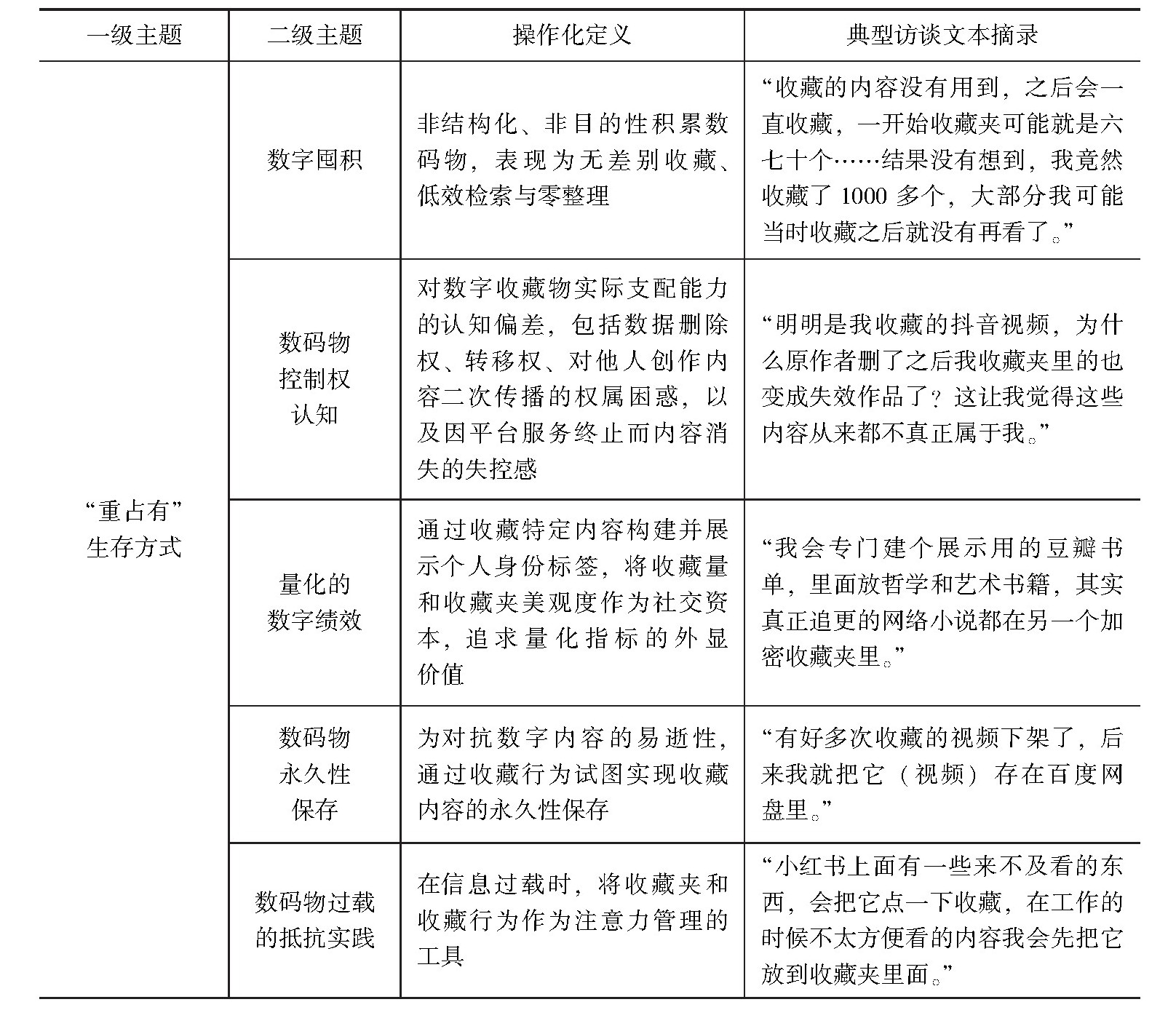 在物的积累主体研究中,既往研究区分了缺乏选择性却重视数量的积累者(accumulators)、受占有欲支配的囤积者(hoarders)和具有组织性且因此受益的收藏者(collectors)。数字收藏者(digital collectors)则特指有选择性地积累数码物以达到个人数字收藏目标的群体;不归档者(no filers)作为一种特殊的数码物积累主体,他们从不整理数码物,依赖平台的搜索引擎来找到所需要的数据。综合对数码物积累的行为本身和行为主体的研究可见,数码物尽管摆脱了时空束缚,但积累行为仍延续着部分实体物时代的关系特征,数码物的积累行为在更多时候指涉自我与关系,是一种文化实践与社会意义的生成过程。